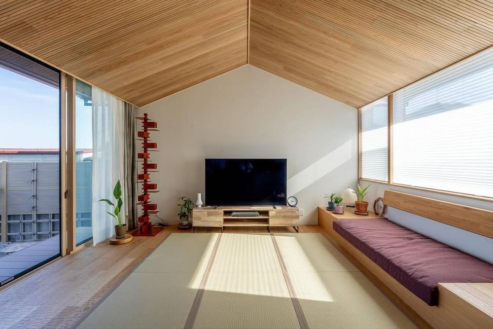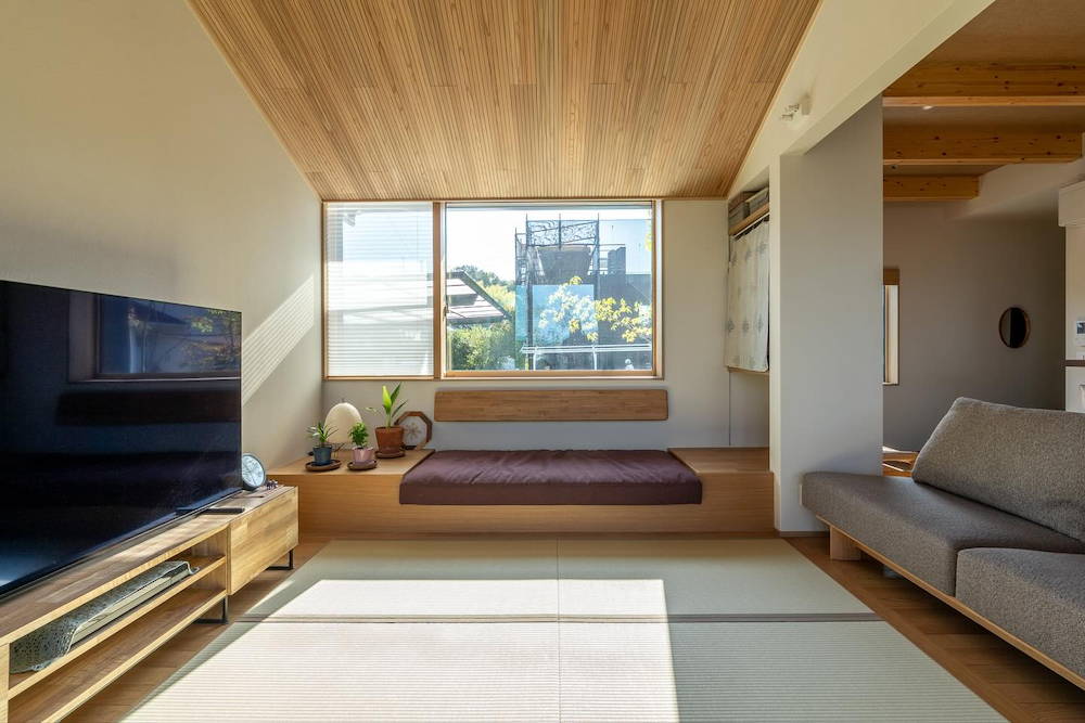 天井に奥行きを生む、繊細な線。小幅板風が演出する、静かな美